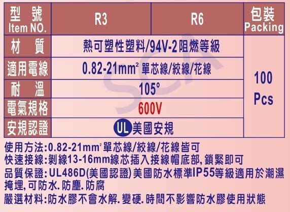 UL486D(美國認證)美國防水標準IP55等級適用於潮濕掩埋,可防水.防塵.防腐